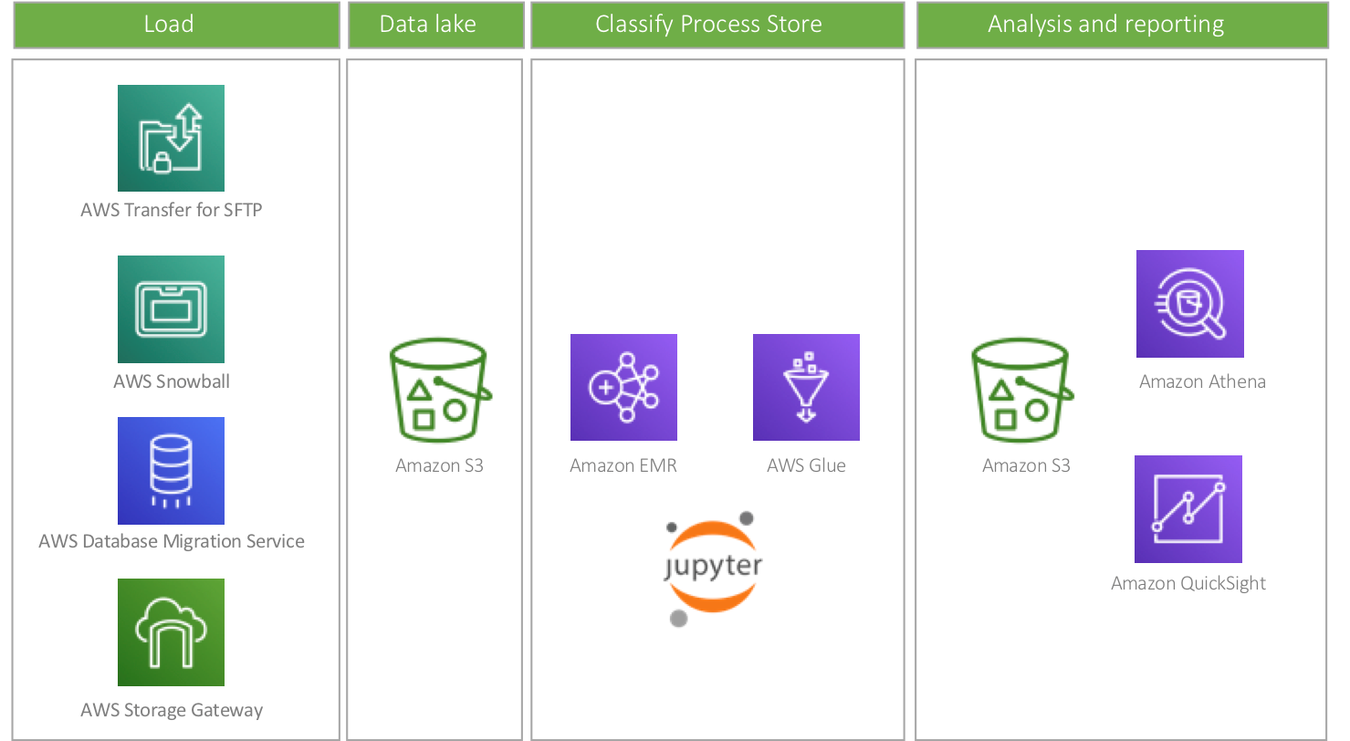 Automated services load data to the Data Lake in Amazon S3 Amazon EMR with Jupyter notebooks and Amazon Glue process and transform the data Amazon Athena enables users interactive, SQL style analysis of Amazon S3 data Amazon QuickSight allows dynamic, drilldown, pivot table reporting and automated pdf/html reports to stake holders AWS Snowball was used for the initial 20TB data injection into the Data Lake 2TB of monthly data added from multiple vendor database sources with Database Migration Service and csv files via Storage Gateway: File Gateway