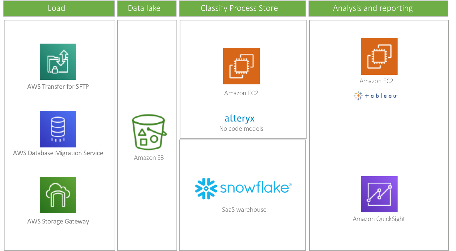 Snowflake data warehouse with 26Tb of data Strong data warehouse roles and security model Optimised cost warehouse utilisation for near zero cost waste Alteryx for analytics models (business requirement: No code). AWS based Alteryx server for orchestration Tableau and Quicksight for reporting and visualisation